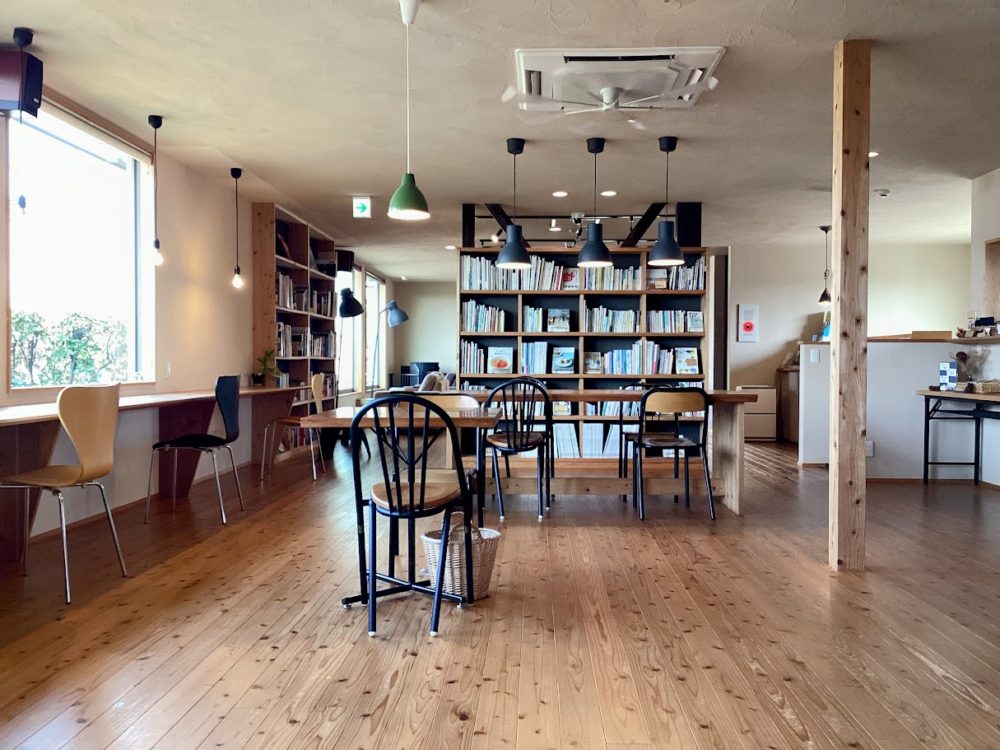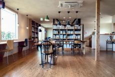 珪藻土の壁と無垢の床に包まれた、自然素材が心地よいブックカフェ。
