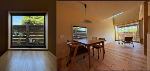 リビングから、キッチンから、ダイニングから、浴室から、ウッドデッキから、道路から、向かいの家から、様々な角度からの検証をして建築、インテリアと共に最適解を探し求めます。