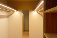 通常ウォークインクローゼットの照明は、ダウンライトや、ブラケット等を使用する事が多いですが、棚下に照明を設ける事で、灯かりが洋服類を照らし収納品を見やすくなるようになっています。